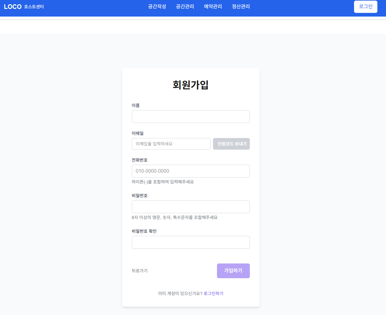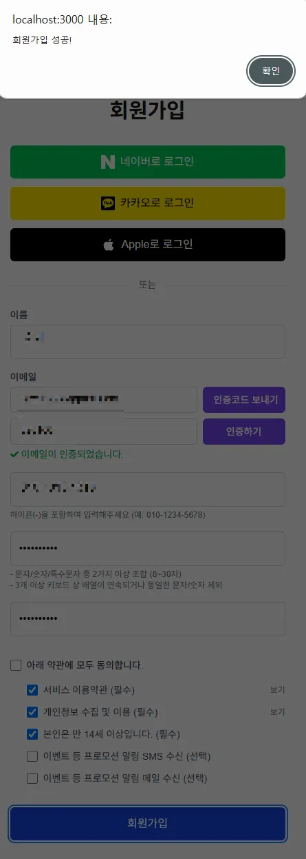게스트 회원가입 페이지와 마찬가지로 이메일 인증 로직과 전화번호, 비밀번호 유효성 검증 후 회원가입이 이루어짐