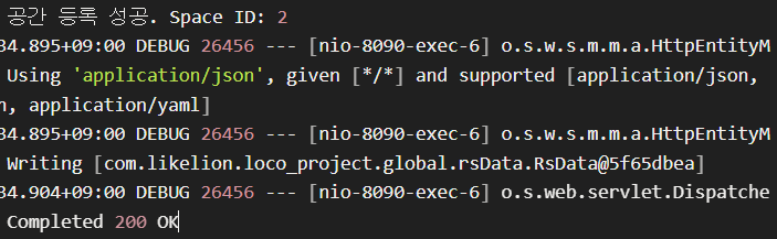 200 응답코드와 함께 공간 등록이 성공되었다는 로그메시지 출력