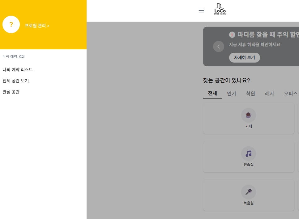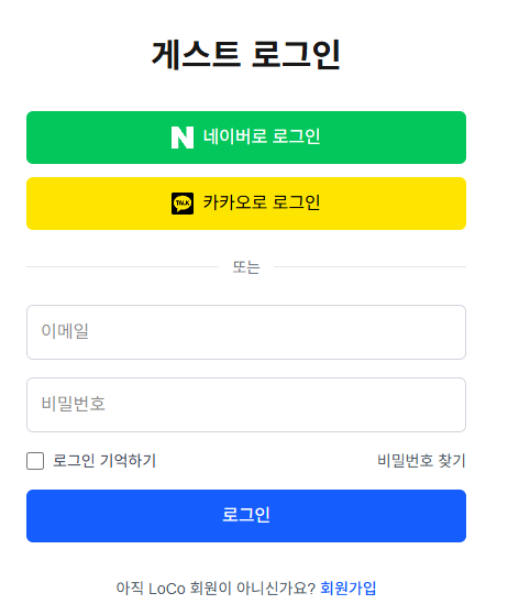 - 로그인 버튼을 누르면 게스트 로그인 (공간을 이용하는 유저) 화면으로 이동하고,