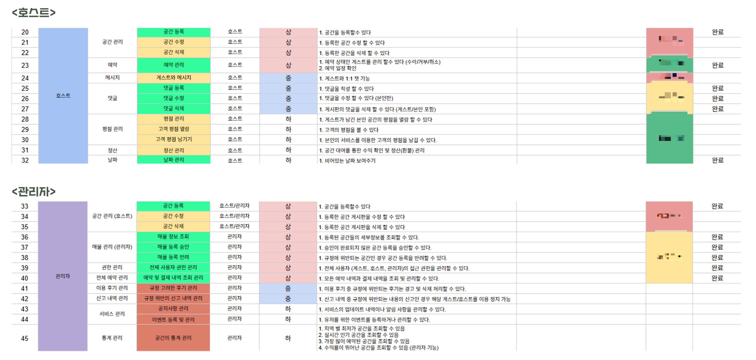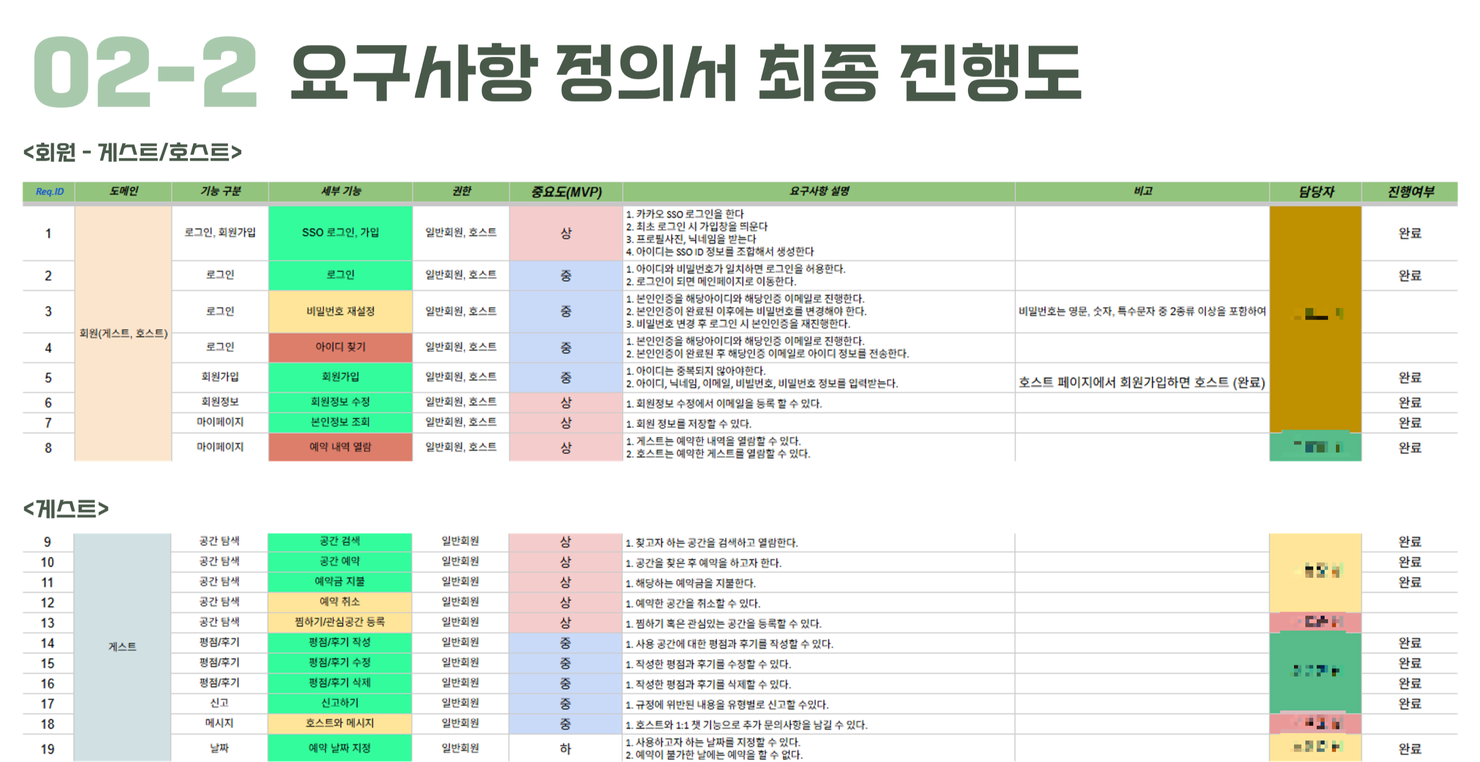 서비스를 개발하면서 필요해진 기능까지 추가하며 업데이트했던 요구사항 정의서 시트지 - 팀원들과 각자 해낸 기능개발이 생기면 바로 체크해놓을 수 있도록함