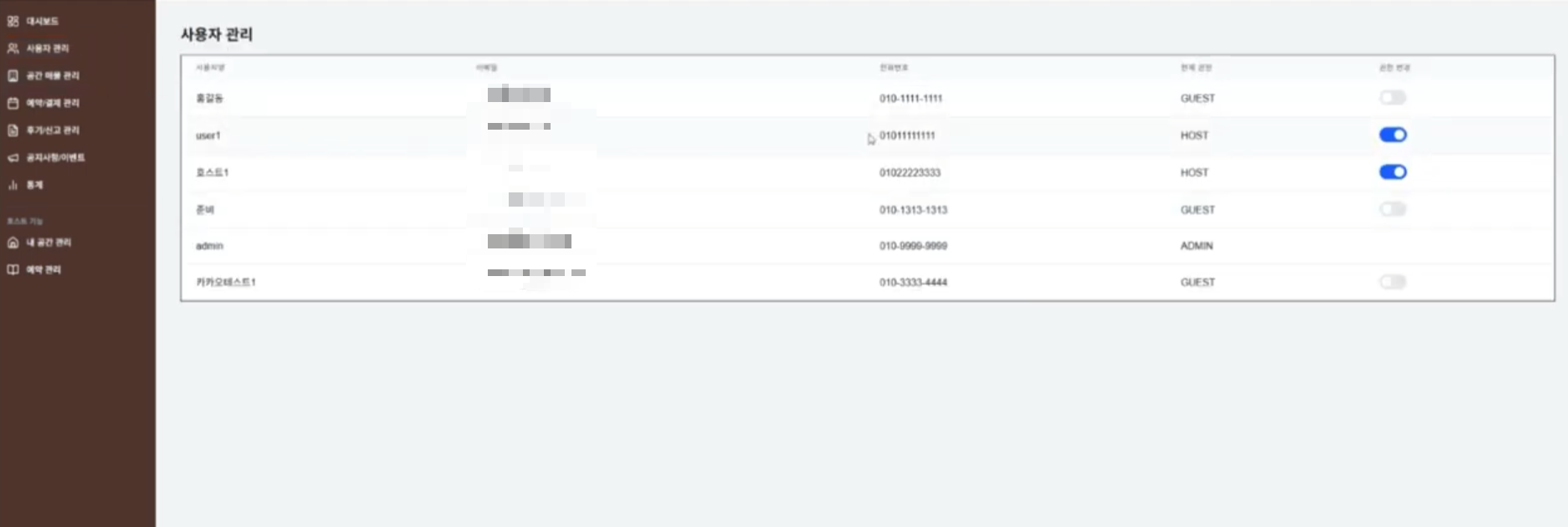 - 사용자 관리페이지에서는 해당 사용자의 권한을 변경할 수 있는 토글 버튼 (GUEST ➡️ HOST 혹은 HOST ➡️ GUEST)과