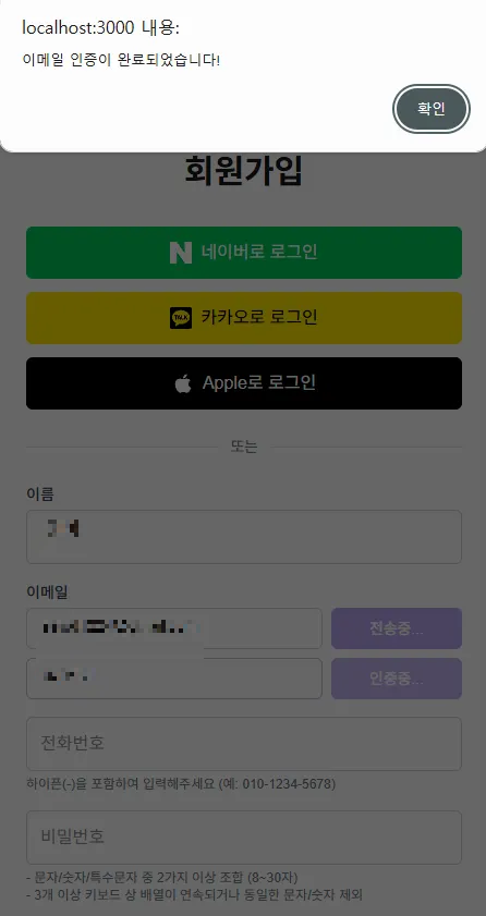 - 이메일 인증 기능과 이메일, 전화번호, 비밀번호 유효성 검증을 통해 회원가입을 원활히 진행