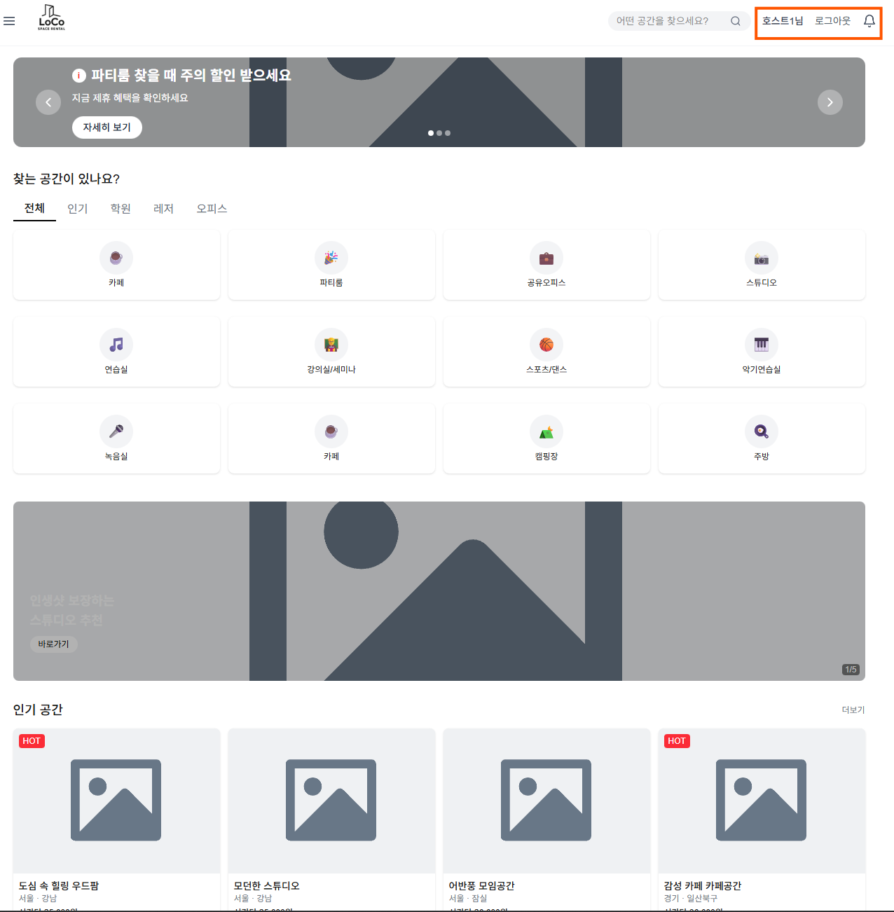 1) 메인 페이지 (등록된 공간들 확인)