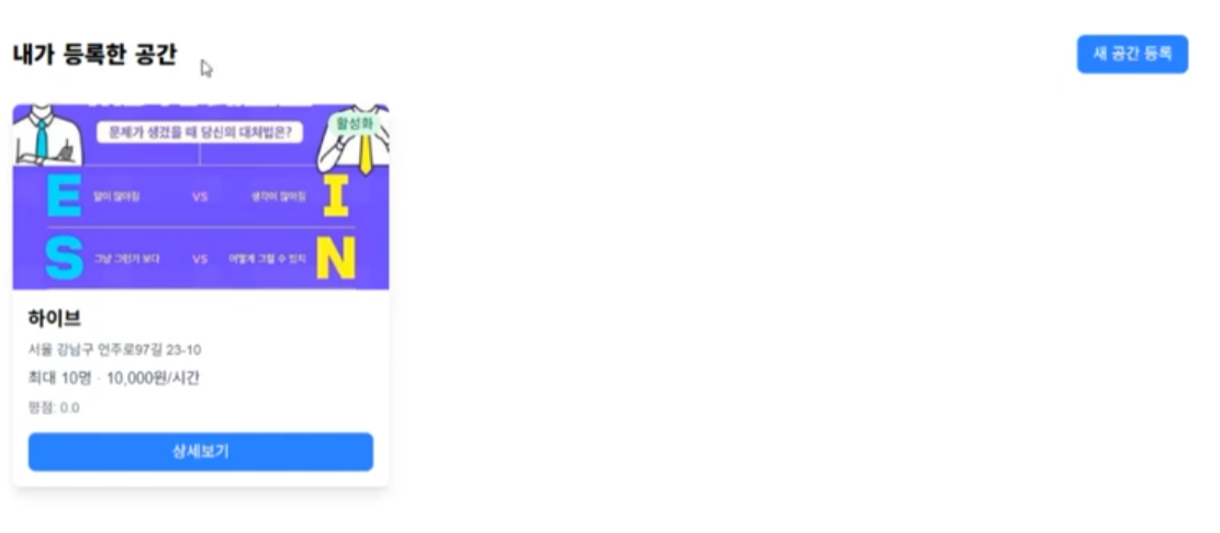 - 이처럼 모든 공간의 정보 입력 및 등록을 완료한 후에는 호스트의 공간 정보 페이지 내에서 등록한 공간을 확인할 수 있도록 구현