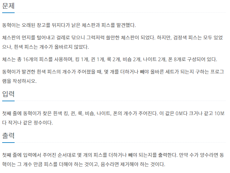 3003번: 킹, 퀸, 룩, 비숍, 나이트, 폰
