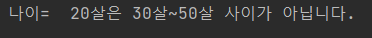 print('나이= ' + str(age) + '살은 30살~50살 사이가 아닙니다.')