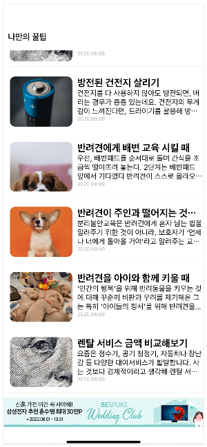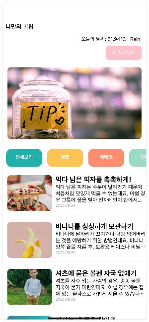 - 예로, '생활'버튼을 누르게되면 생활에 관련된 리스트화된 꿀팁들이 분류되어 화면에 보여지게 됩니다.