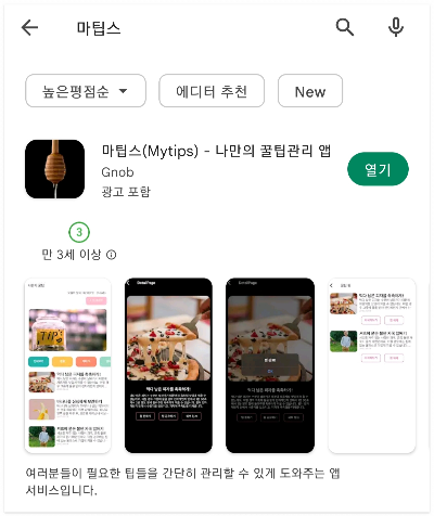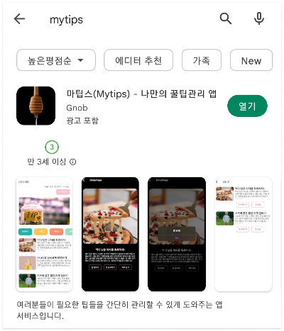 구글 플레이스토어 (Googld Playstore)에 출시되어있는 프로젝트 입니다. 프로젝트 명(=앱 이름)은 마팁스(Mytips)이며, 꿀팁들을 관리할 수 있게 도와주는 어플입니다.