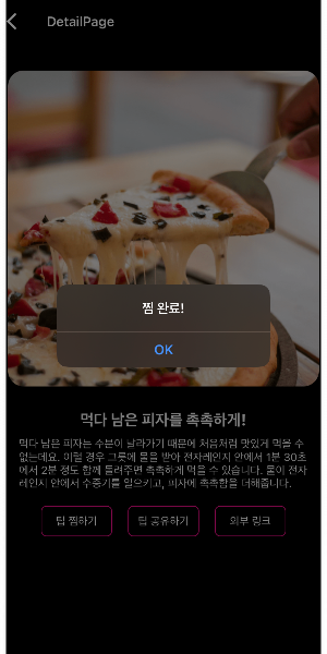 '팁 찜하기' 버튼을 누르게되면 '찜 완료!' 라는 팝업과 함께 유저가 원하는 팁을 저장할 수 있게됩니다.