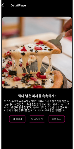'꿀팁 찜' 화면에서도 '자세히보기' 버튼을 누르게되면 그 꿀팁의 상세페이지로 이동할 수 있게 구현되어있는 모습입니다.