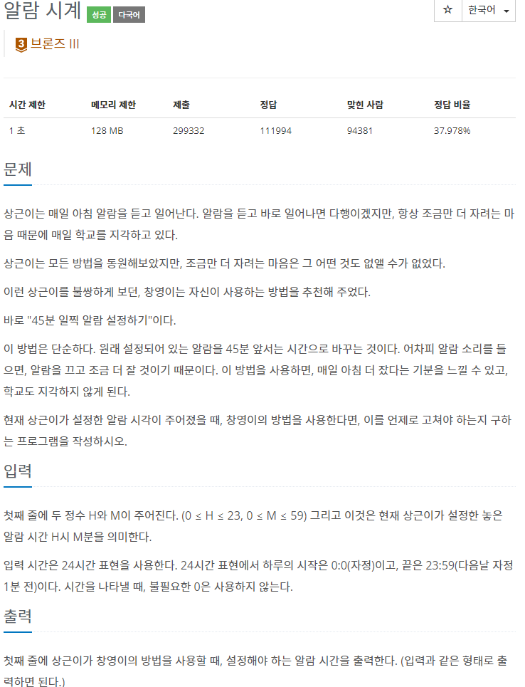 https://www.acmicpc.net/problem/2884 2884번: 알람 시계 문제 상근이는 매일 아침 알람을 듣고 일어난다. 알람을 듣고 바로 일어나면 다행이겠지만, 항상 조금만 더 자려는 마음 때문에 매일 학교를 지각하