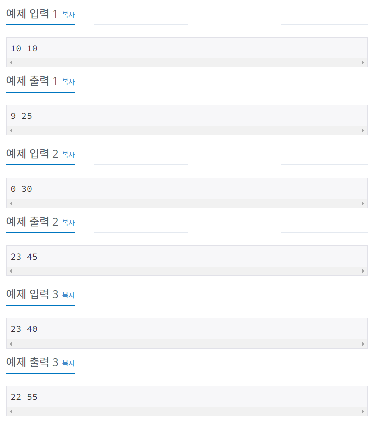예상외로 간단한 로직이었다. 크게는 두가지로 나뉘는데, 주어진 m(분) 이 45보다 작을 경우와 아닐 경우이다.