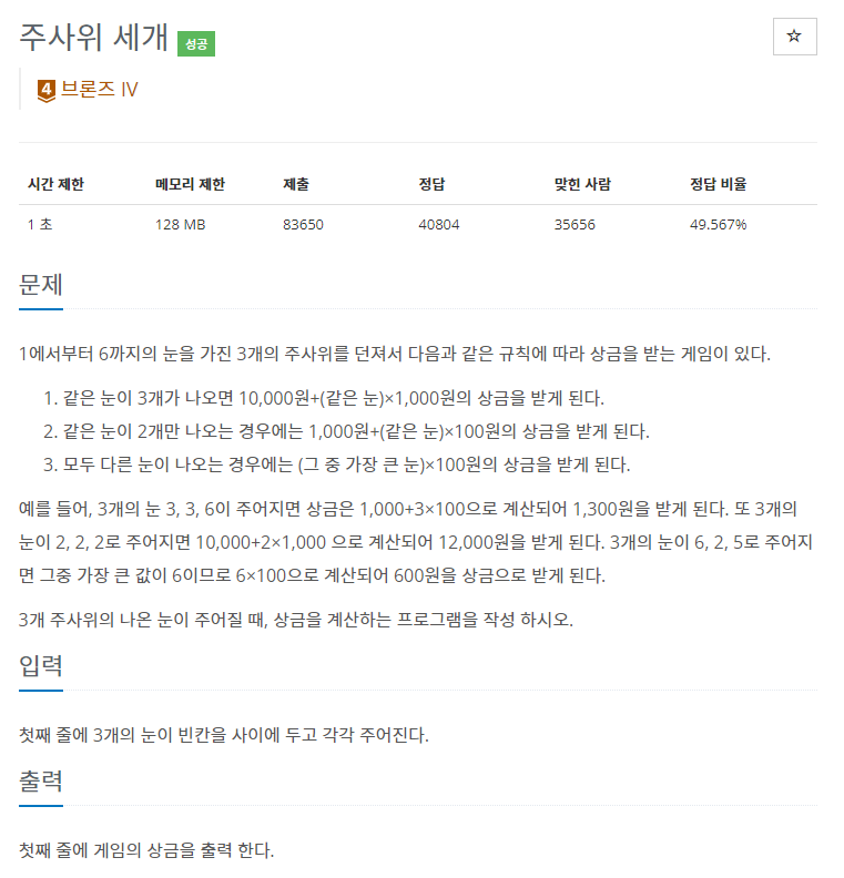 각 경우마다 상금으로 받는 금액이 달라질 수 있기때문에 (= 주사위 눈이 다른 경우일수도 있음) 다른 조건문들을 추가해주어 처리하였다.