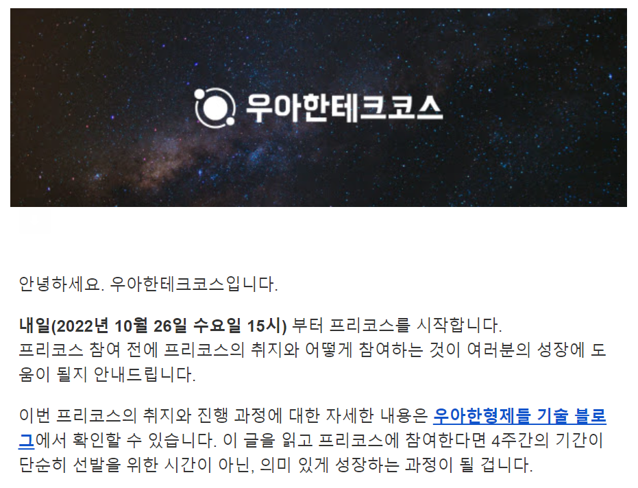 조금씩 경험하던 중 기다리던 '우아한 테크코스 5기' 모집 지원을 볼 수 있었다.