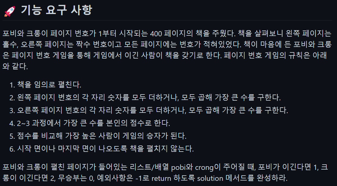 - #1~6까지 각각 테스트에 통과할 수 있는 조건문을 만들었는데, 날코딩이어서 그런지 예시 테스트케이스 2개는 통과할 수 있었지만 제출 후에는 테스트케이스를 통과할 수 없는 것들이 여럿 있었다.