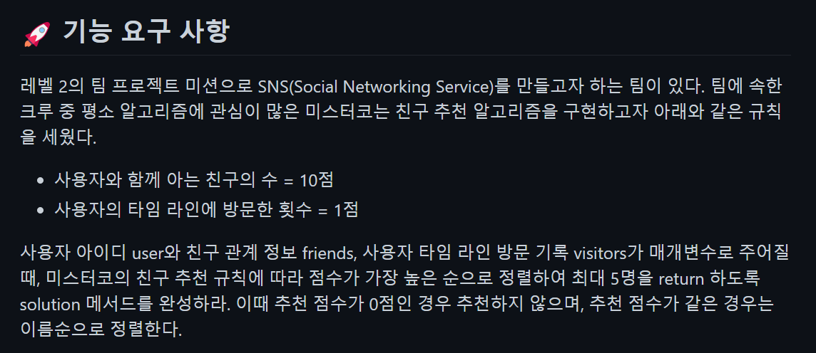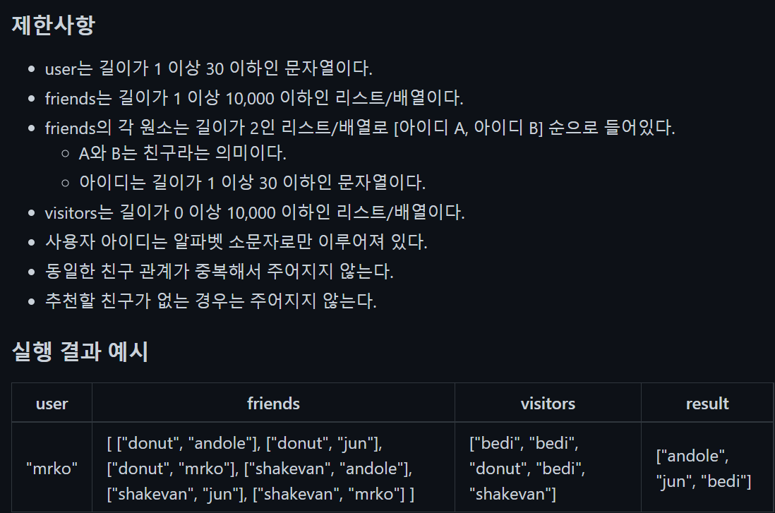 public static List<String> solution(String user, List<List<String>> friends, List<String> visitors) {