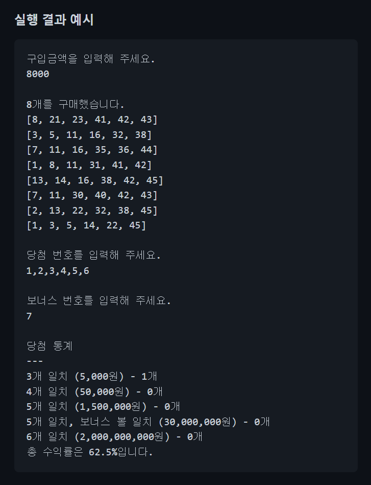 - 당첨 번호 추첨 시 중복되지 않는 숫자 6개와 보너스 번호 1개를 뽑는다.
