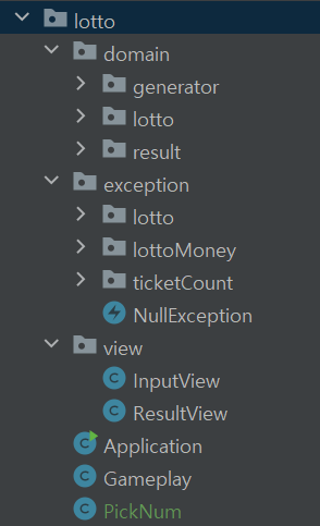 lotto 패키지 안에 기능을 구현할 domain과 예외처리를 할 exception, 화면에 보여지는 view 패키지로 나눌 수 있었다.