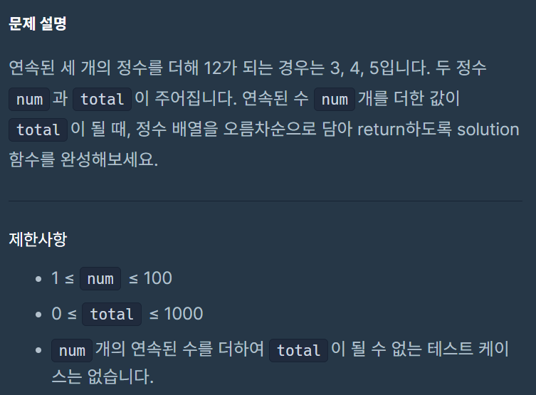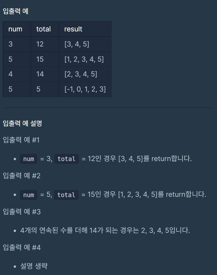 연속된 세 개의 정수를 더해 12가 되는 경우는 3, 4, 5입니다. 두 정수 num과 total이 주어집니다. 연속된 수 num개를 더한 값이 total이 될 때, 정수 배열을 오름차순으로 담아 return하도록 solution함수를 완성해보세요.