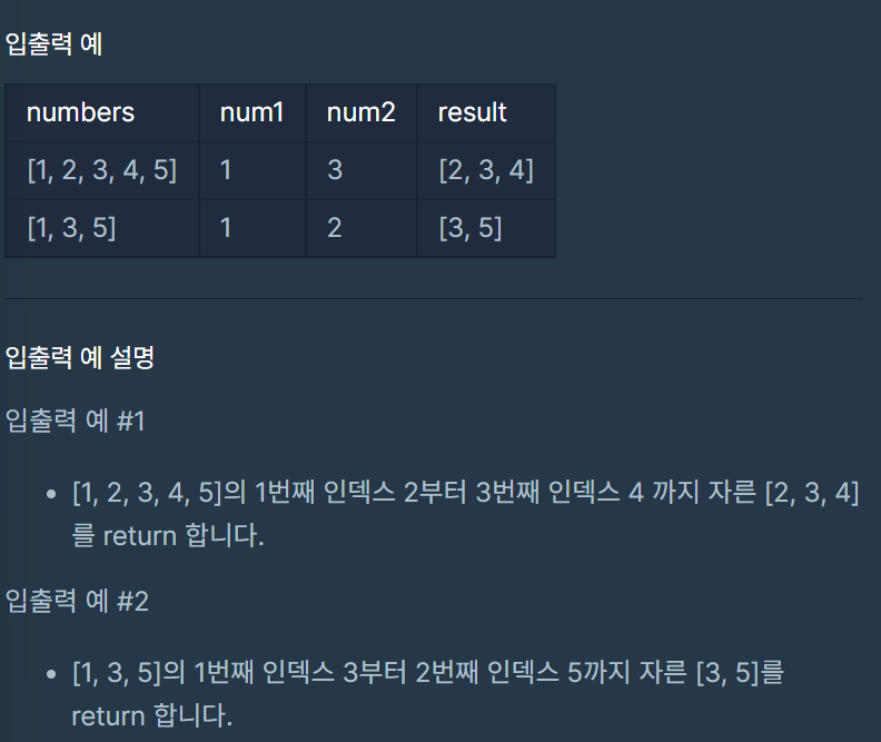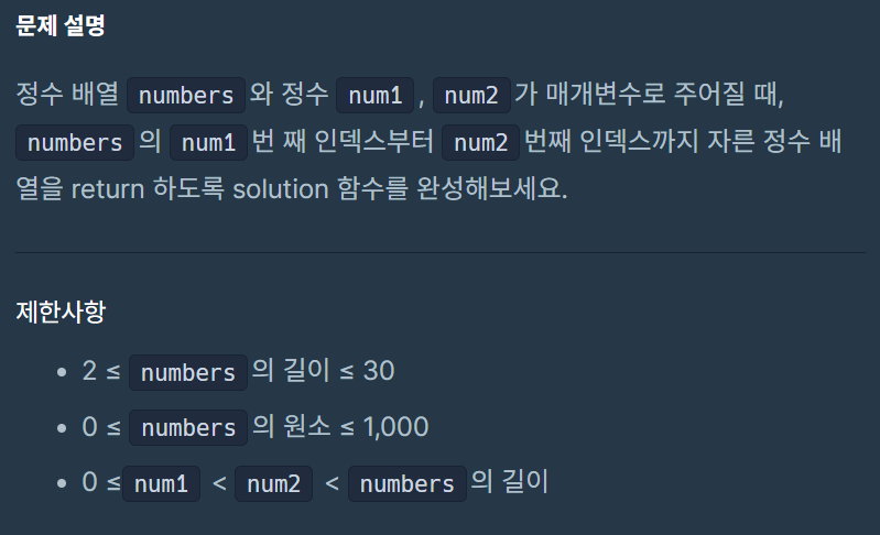 정수 배열 numbers와 정수 num1, num2가 매개변수로 주어질 때, numbers의 num1번 째 인덱스부터 num2번째 인덱스까지 자른 정수 배열을 return 하도록 solution 함수를 완성해보세요.