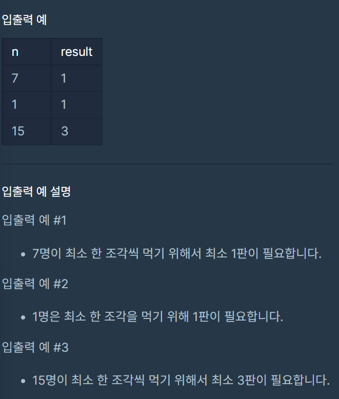 만약 n의 나머지가 0이 아니면 못먹은 사람이 있는 경우이므로 한 판을 더 시켜야한다. >> answer++;