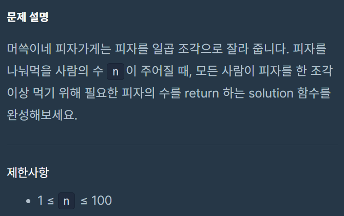 피자를 나눠먹을 사람의 수 n이 주어질 때, 모든 사람이 피자를 한 조각 이상 먹기 위해