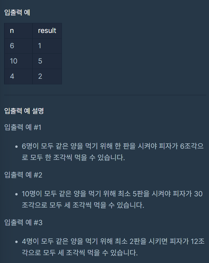 이 과정을 통해 하나의 규칙을 찾았는데, 사람의 수 n과 피자 조각 6의 최소 공배수일때 성립한다는 것이다.