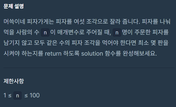 머쓱이네 피자가게는 피자를 여섯 조각으로 잘라 줍니다. 피자를 나눠먹을 사람의 수 n이 매개변수로 주어질 때, n명이 주문한 피자를 남기지 않고 모두 같은 수의 피자 조각을 먹어야 한다면 최소 몇 판을 시켜야 하는지를 return 하도록 solution 함수를 완성해보세요.