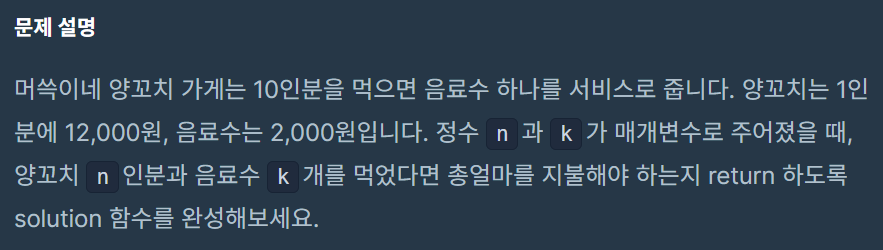 정수 n과 k가 매개변수로 주어졌을 때, 양꼬치 n인분과 음료수 k개를 먹었다면