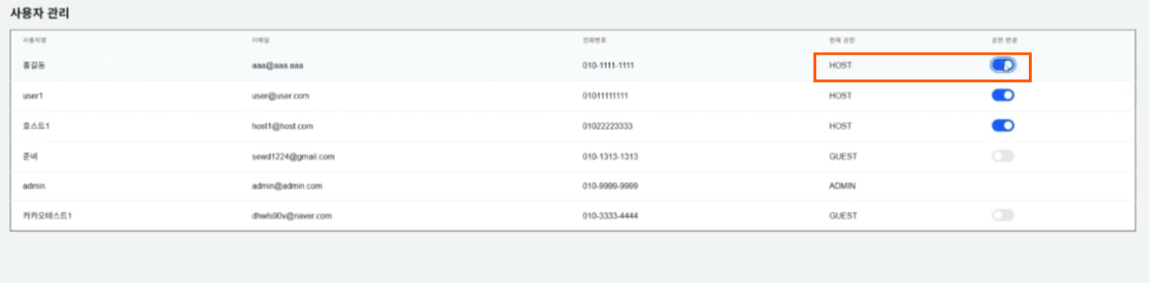 - 사용자 관리페이지에서는 해당 사용자의 권한을 변경할 수 있는 토글 버튼 (GUEST ➡️ HOST 혹은 HOST ➡️ GUEST)과